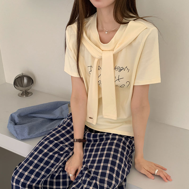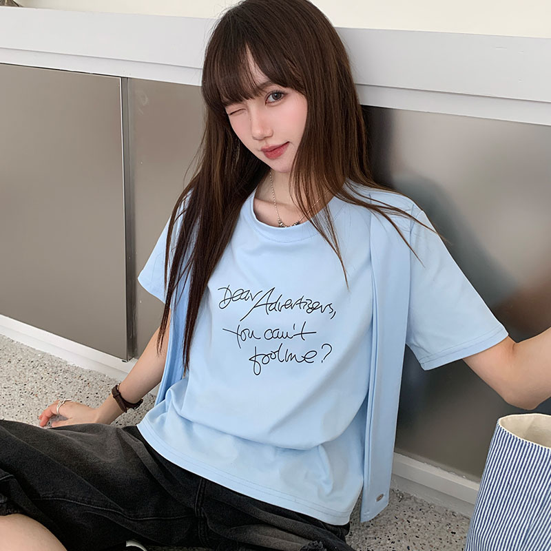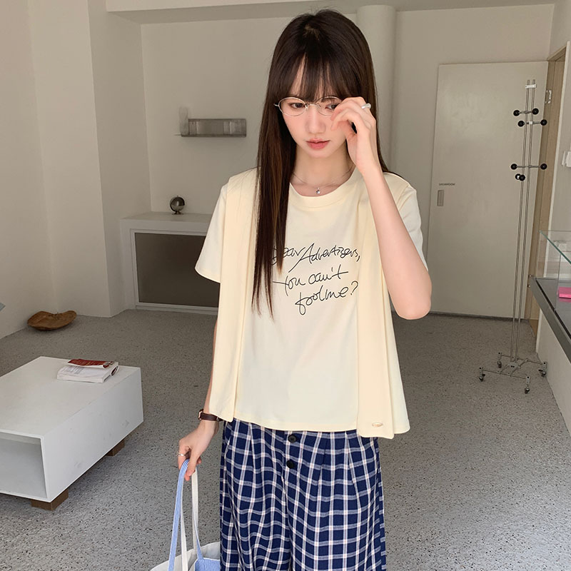 여름에 여성을위한 실제 가짜 2 피스 짧은 소매 티셔츠 2025 신규 인쇄 숄 캐주얼 다용도 느슨한 탑