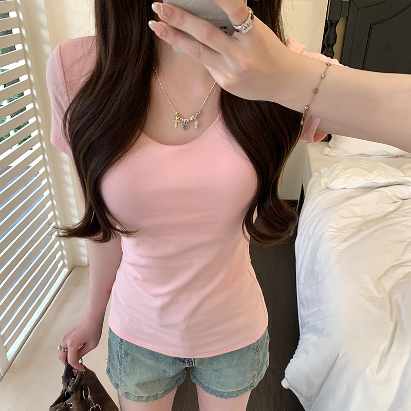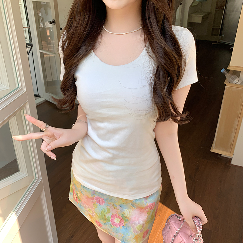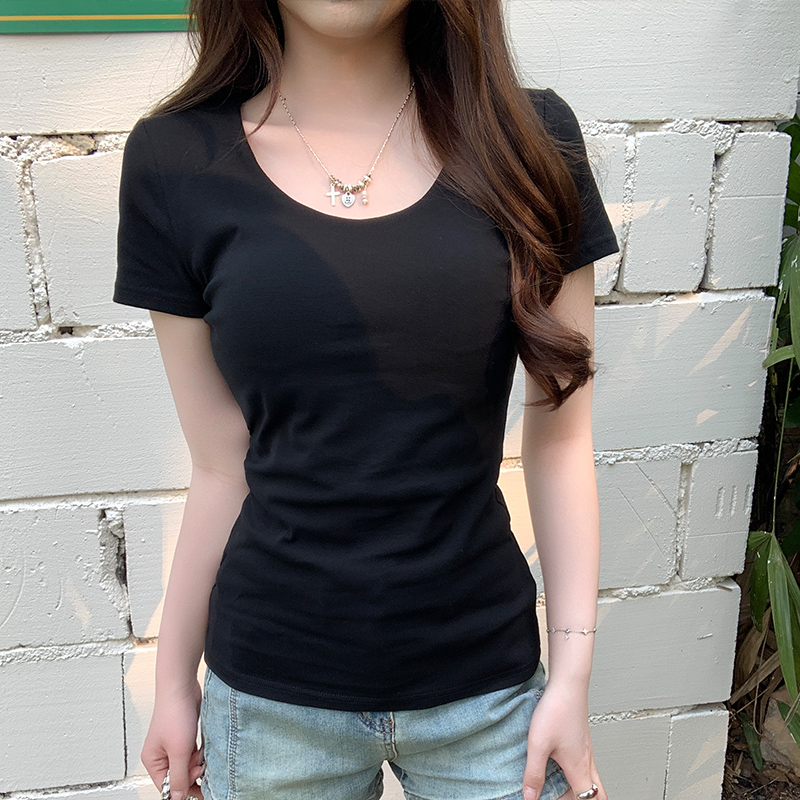 Real-Erice 기본 단색 단색 U-Neck 전면 어깨 단락 티셔츠 여성용 2025 새로운 다목적 슬림 한 낮은 둥근 목 상단