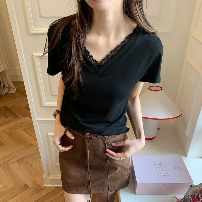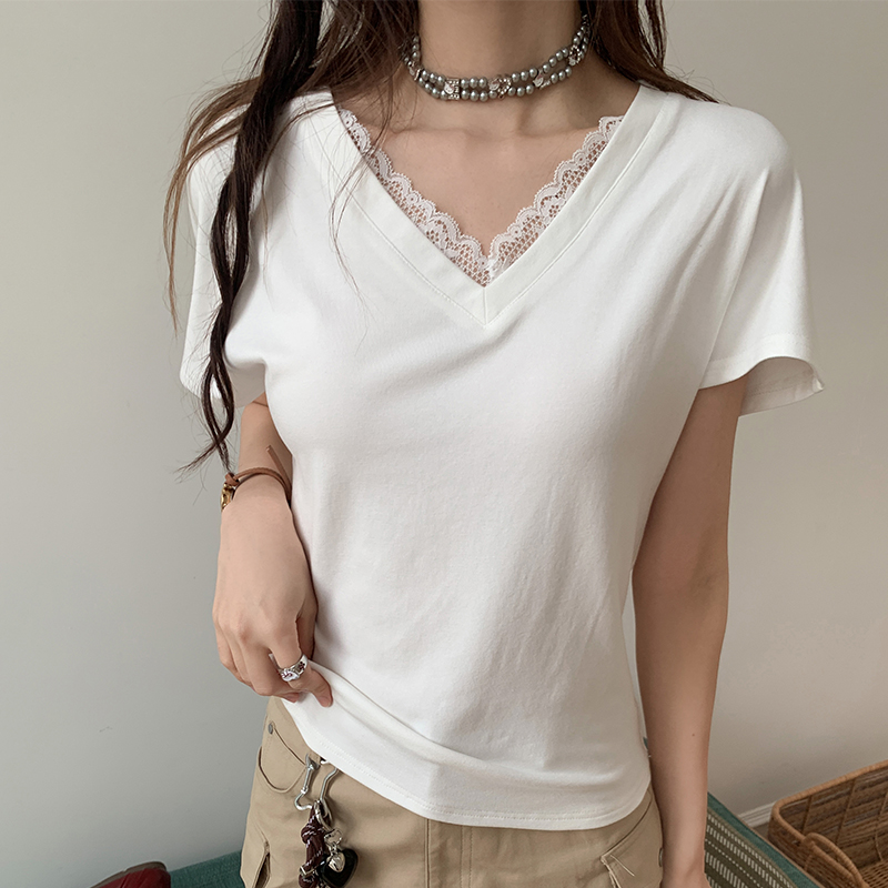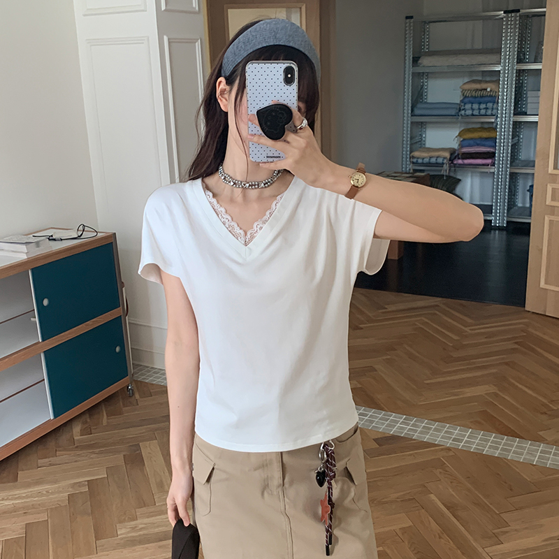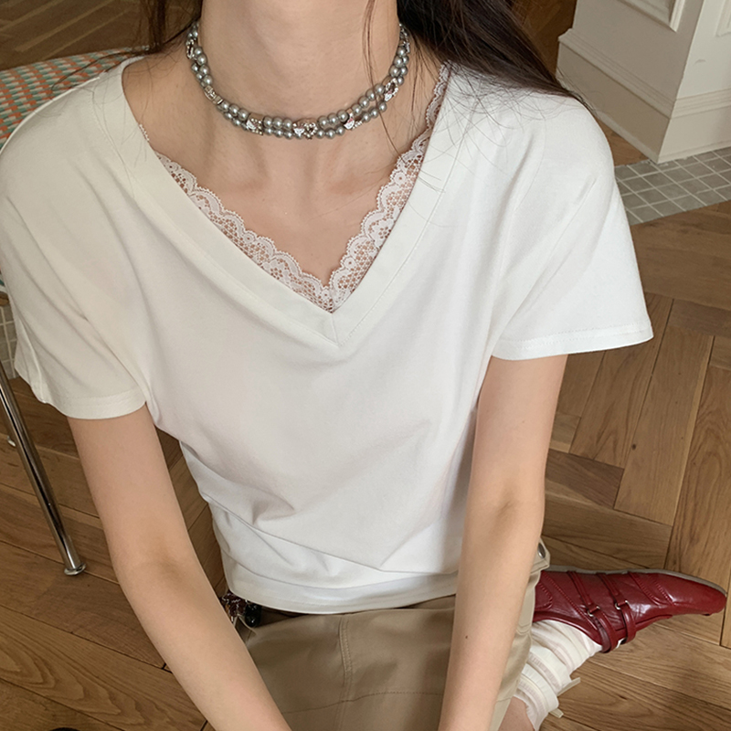실제 가격의 레이스 스 플라이 싱 v- 넥 짧은 소매 티셔츠 여성을위한 2025 New Design Niche Versatile Loose Top