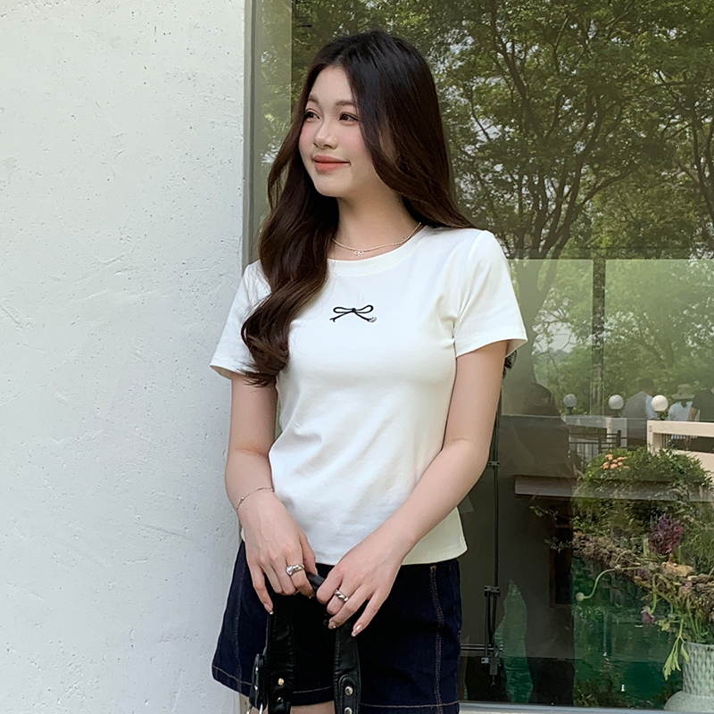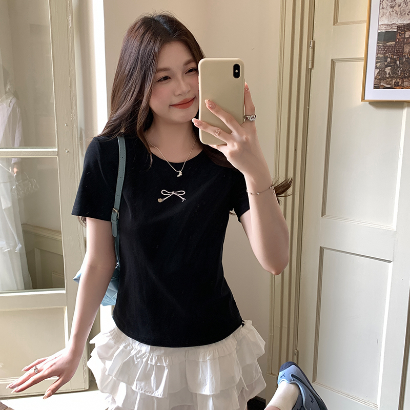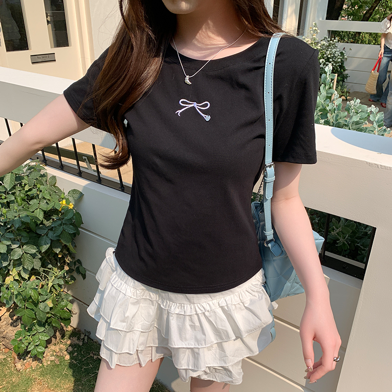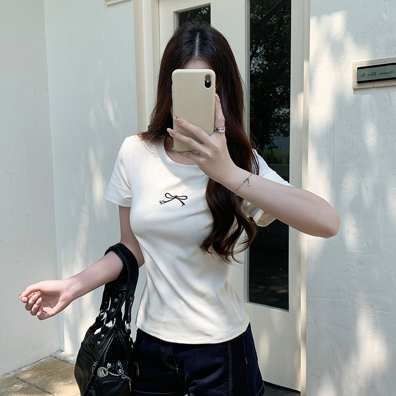 실제 샷 및 실제 가격 # Bow Straight Shouow자 짧은 슬리핑 티셔츠 여성용 2025 여름 새로운 디자인 다목적 라운드 넥 탑