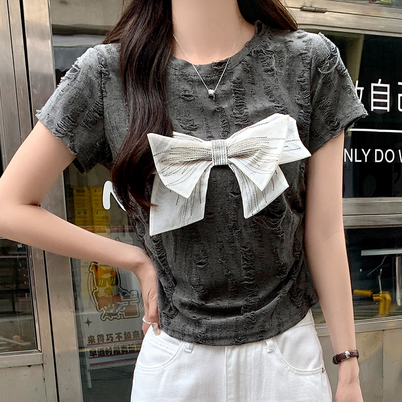 Real-Life Price#Bow Straight Shoulder Short-Sleeved 티셔츠 여성 여름 2025 New Design Sense Hollow Pleated Short Top