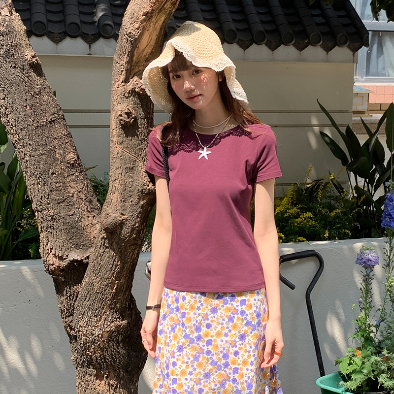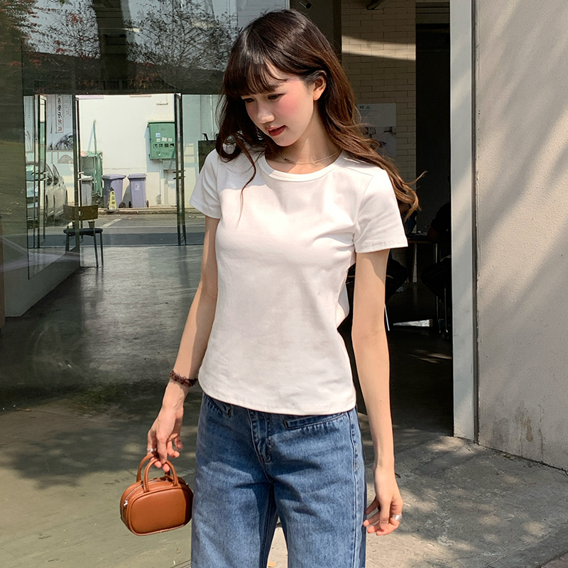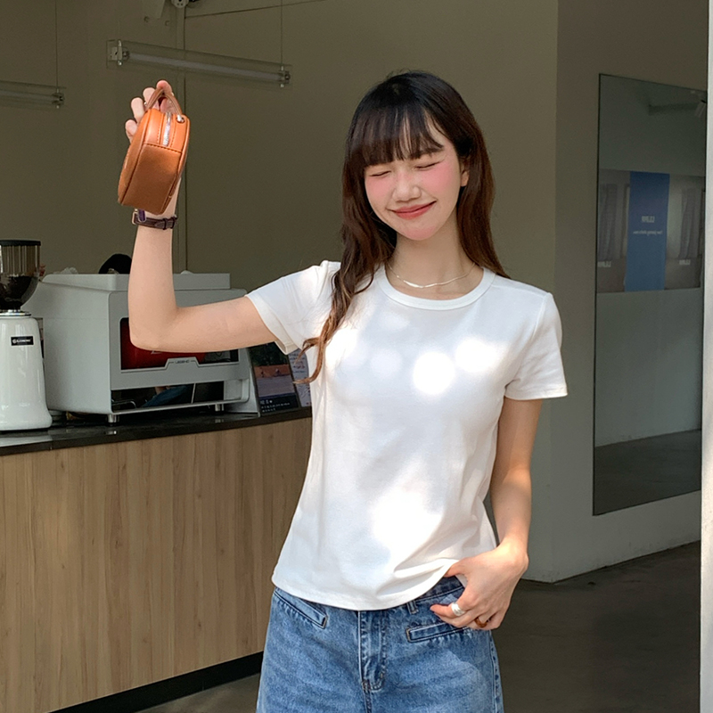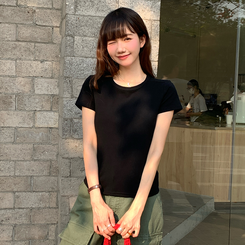 실제 촬영, 실제 가격 전면 어깨 어깨 단락 티셔츠, 여름 2025 여성을위한 새로운 다목적 단색 단순한 둥근 목 티셔츠